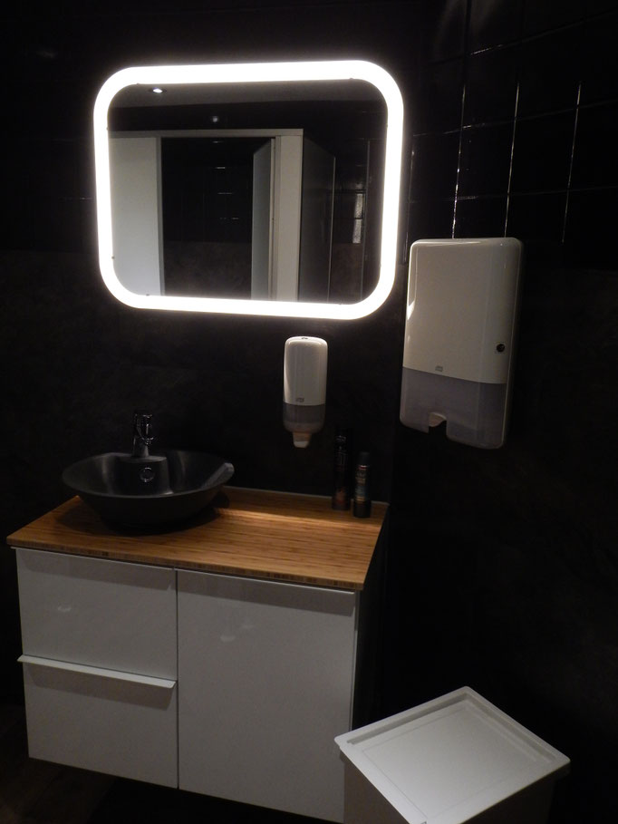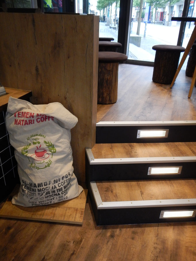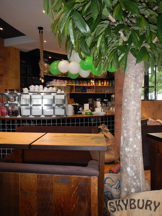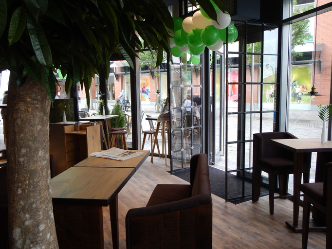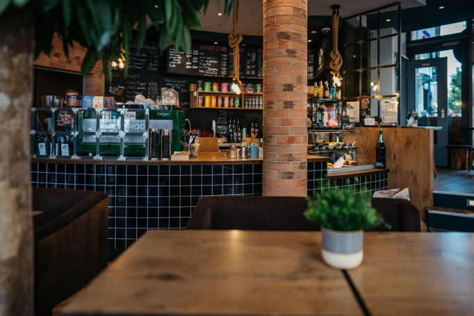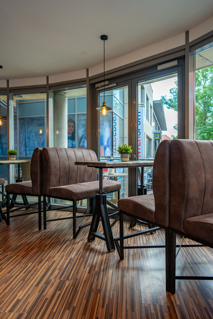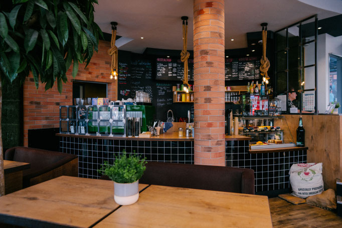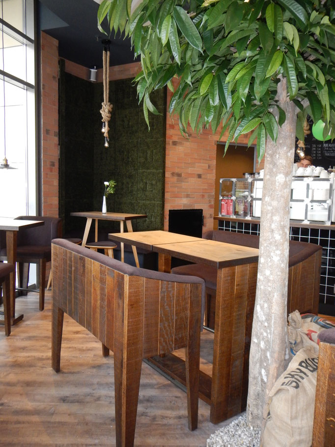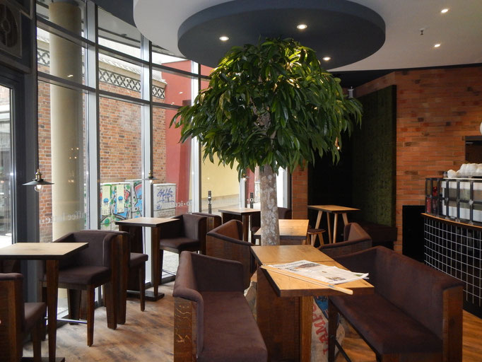 Wir bieten einen tollen Platz zum Sitzen, eine grüne Terrasse mit Wagenbänken sowie viel Holz und edle Metalle runden das Konzept ab.